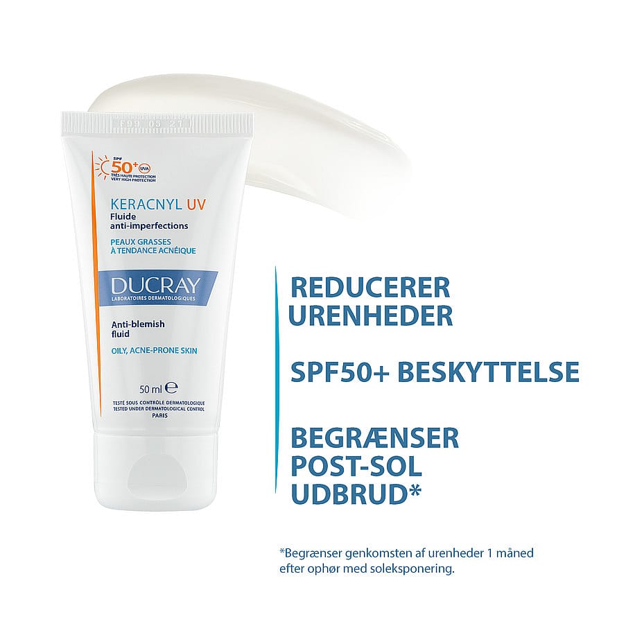 Keracnyl UV50 Fluid SPF50+ virker effektivt på urenheder og beskytter huden mod solens skadelige stråler. Modvirker at urenheder vender tilbage efter sommeren.