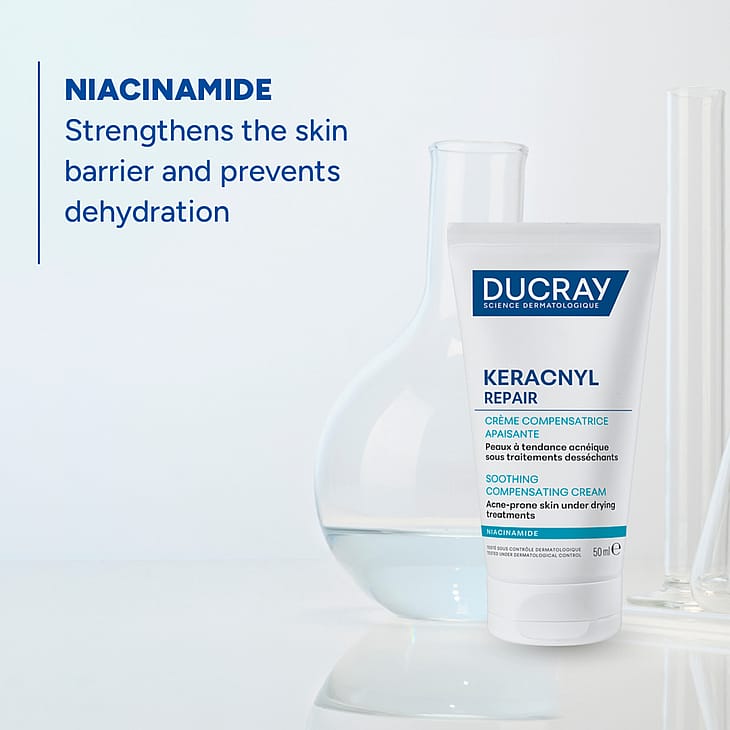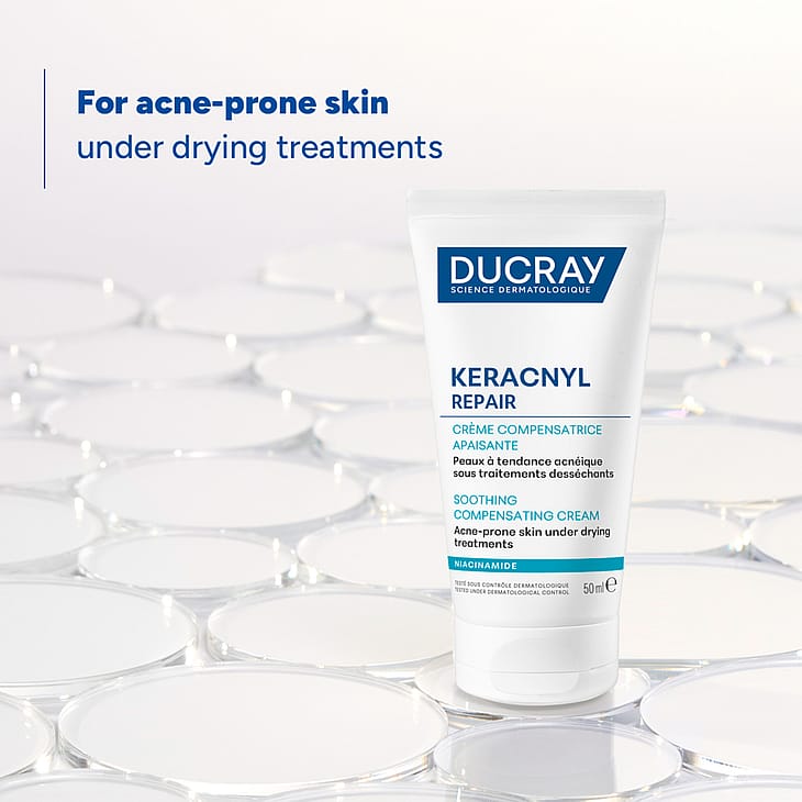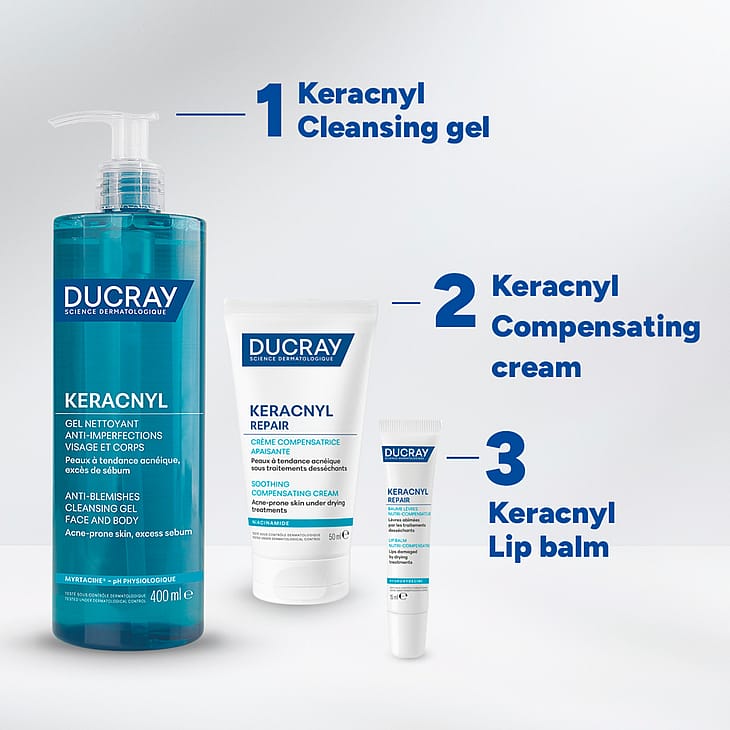 Start med at rense huden med fx Ducray Keracnyl Anti-Blemish Foaming Cleansing Gel for at fjerne overskydende talg og urenheder. Påfør derefter et jævnt lag af cremen og lad produktet absorbere ind i huden. Undgå kontakt med øjnene. Produktet er velegnet til daglig brug og kan anvendes af både teenagere og voksne med hud, der er påvirket af udtørrende aknebehandling.