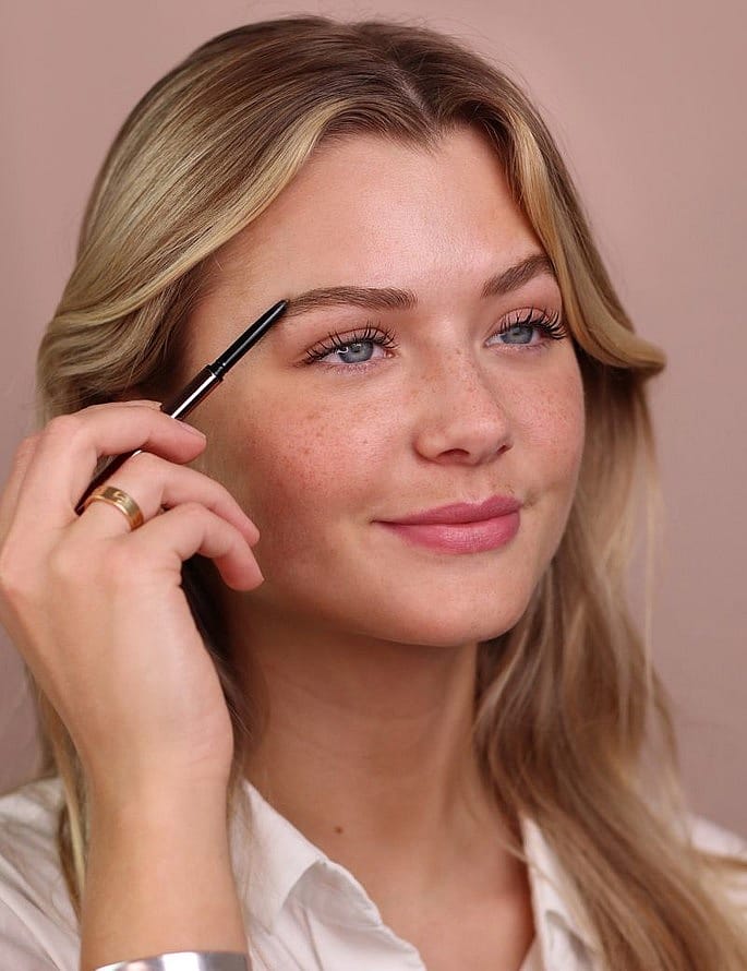 Start med den yderste del af brynet og opbyg definition og fylde ved at lave små, korte strøg. Flere strøg for mere definerede bryn. Lav derefter små, lette, opadgående strøg på den inderste del af brynet for en blid og naturlig definition.