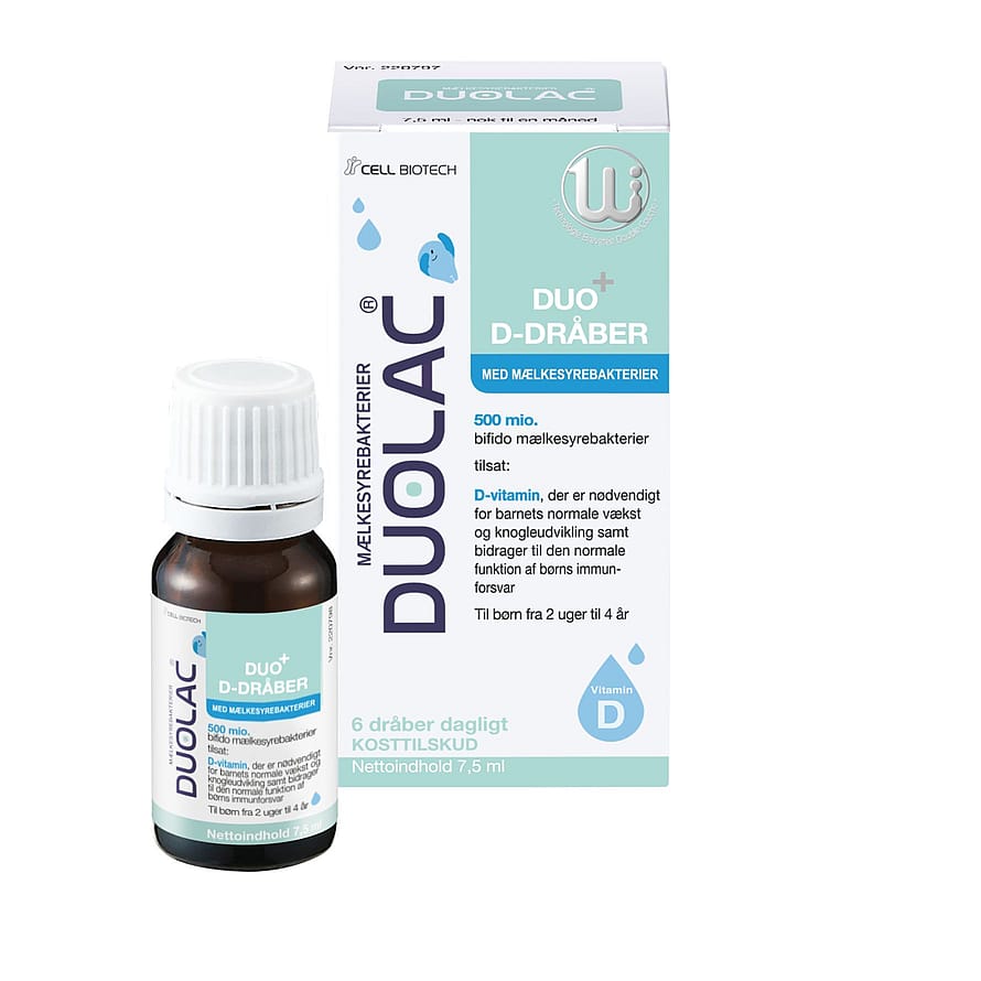 Kosttilskud. DUOLAC DUO+ D-dråber er til baby fra 2 uger, og kombinerer mælkesyrebakterier med D-vitamin.