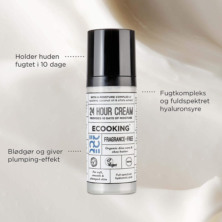For ekstra fugt og fylde kan du påføre ECOOKING Hyaluronic Serum inden cremen. Hyaluronic Serum og 24 Timers Creme indeholder begge fuldspektret hyaluronsyre, som binder fugt i alle hudlag og giver langvarig, dybdegående pleje.