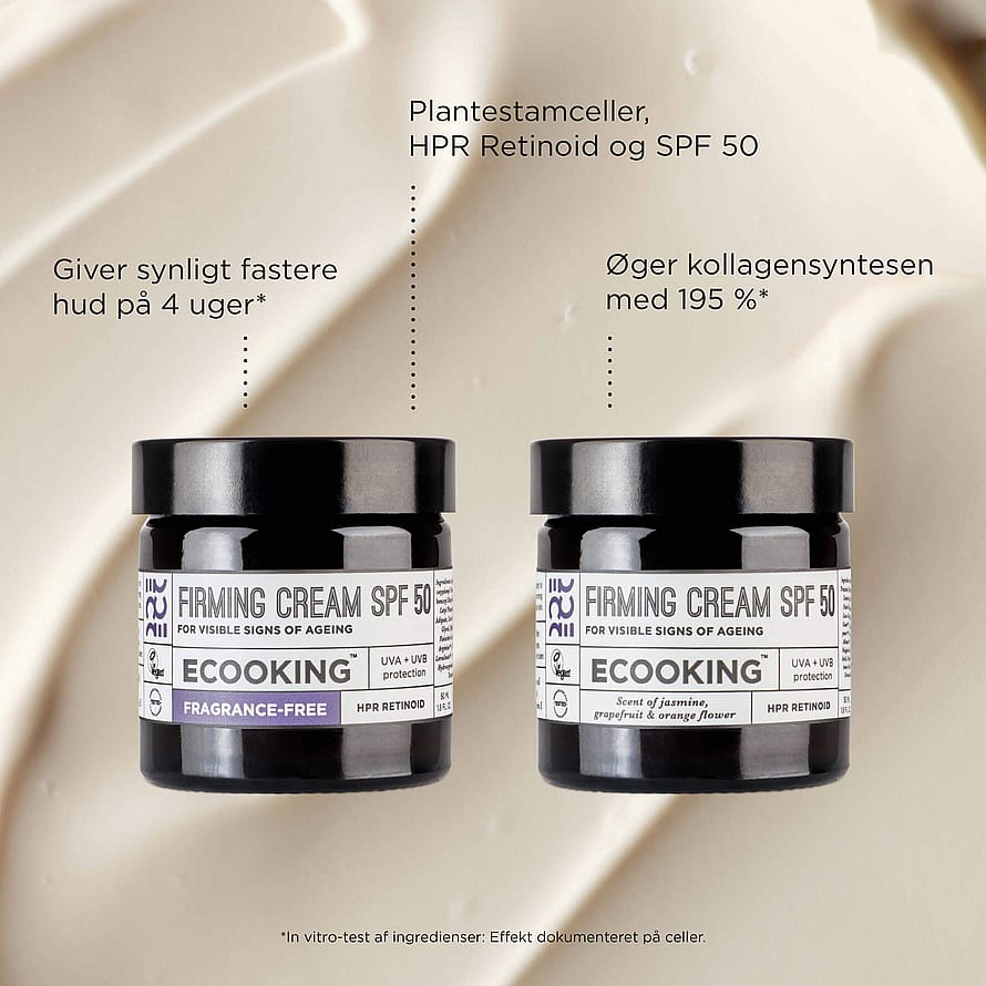 Firming Cream SPF 50 beskytter huden mod solens skadelige UVA- og UVB-stråler. Trods solfiltre glider den let på huden og absorberer hurtigt. Duft af jasmin, grape og appelsinblomst. Vegansk og dermatologisk testet. Firming Cream SPF 50 falder i den kategori, som hudplejebranchen typisk kalder ”anti-age”. Hos ECOOKING lægges der i stedet vægt på, hvilke resultater produktet giver – og det viser sig særligt effektivt til at mindske synlige alderstegn som fine linjer samt give ansigtet fornyet vitalitet, glød og fylde.