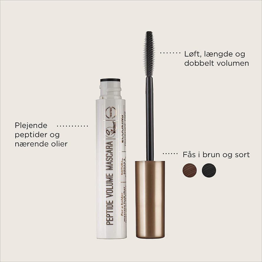 Mere længde. Mere løft. Mere volumen. Peptide Volume Mascara er til dig, der gerne vil have lidt mere af det hele - i en blød brun farve for et mere naturligt look. Silikonebørsten fordeler nemt mascaraen på vipperne, og med sine tætsiddende pigge og en let afrundet spids sikrer den præcis og jævn påføring. Selve opskriften er fyldt med plejende ingredienser, lige fra styrkende peptider til nærende olier og vitaminer, så dine vipper forbliver sunde og velplejede, uanset hvor meget du lægger på. Peptide Volume Mascara giver en glat finish, der holder hele dagen uden hverken at klatte eller drysse. Parfumefri, vegansk og dermatologisk testet.