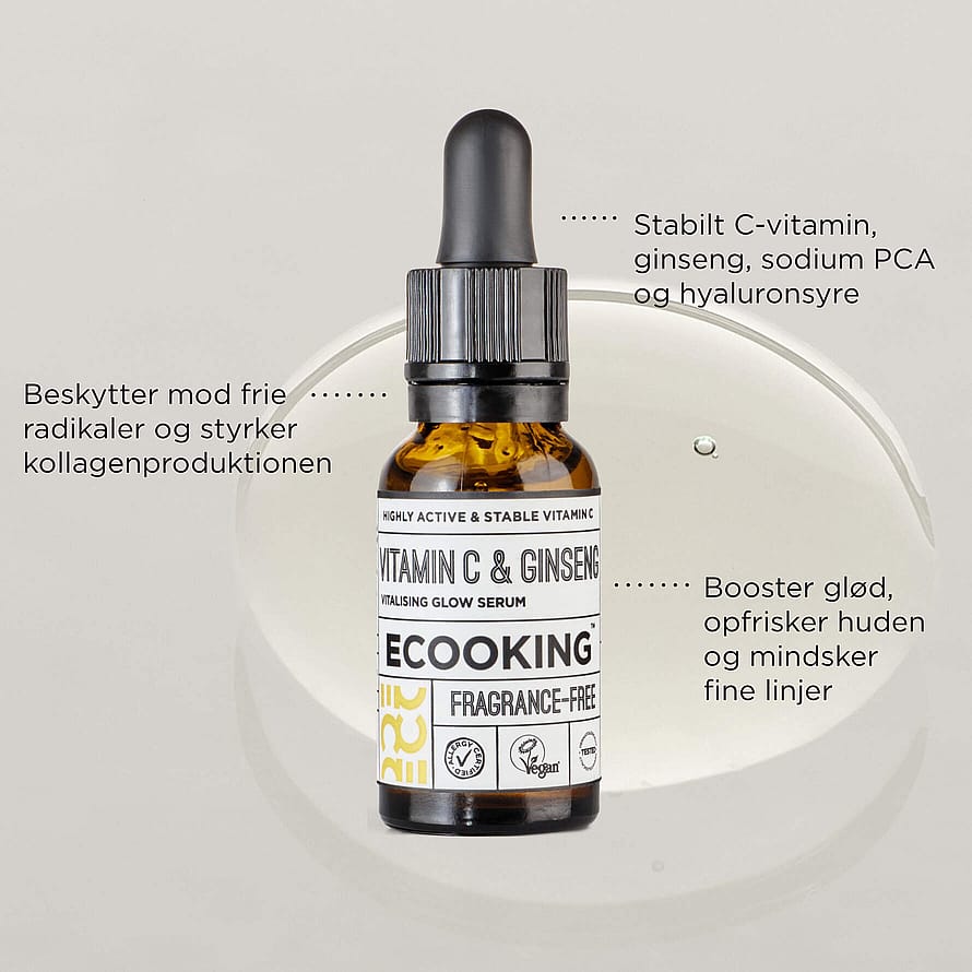 ECOOKINGs Vitamin C & Ginseng Serum Fragrance-free er spækket med aktiv forkælelse til din hud, som styrker, beskytter, udglatter og giver den flotteste glød.