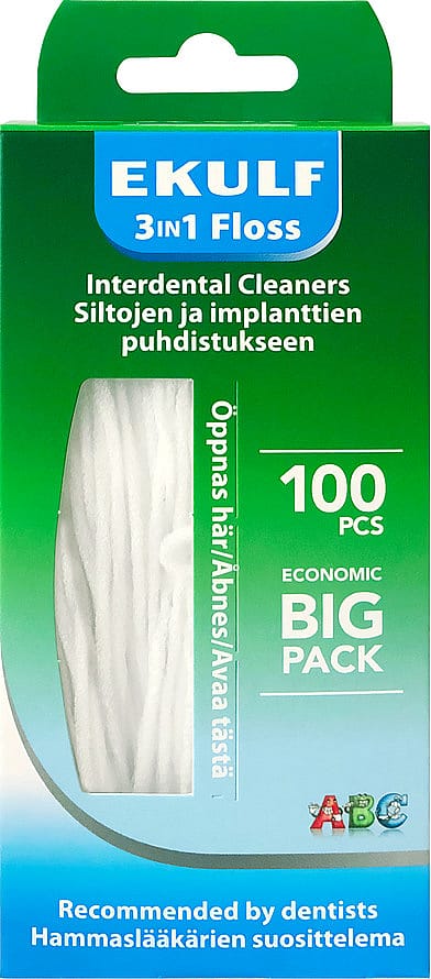 Ekulf 3i1 Floss er en tandtråd med flosset børstedel i midten og stive ender.