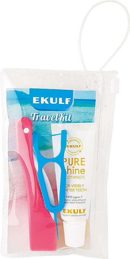 Rejsesættet indeholder en sammenklappelig tandbørste, EKULF TravelBrush, EKULF PURE shine tandpasta 12 ml og en EKULF BeTweeners tandtråd.