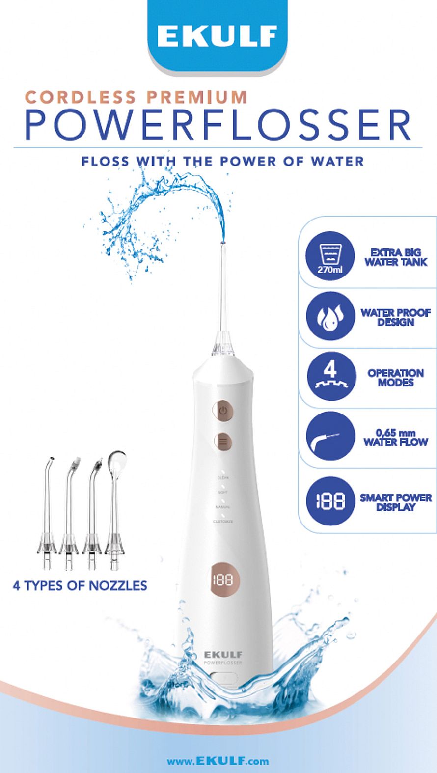 EKULF PowerFlosser Premium er en kraftfuld og elegant mundbruser, der fjerner plak og bakterier mellem tænderne og dybt ned i tandkødslommerne, hvor almindelig tandtråd ikke kan nå.
