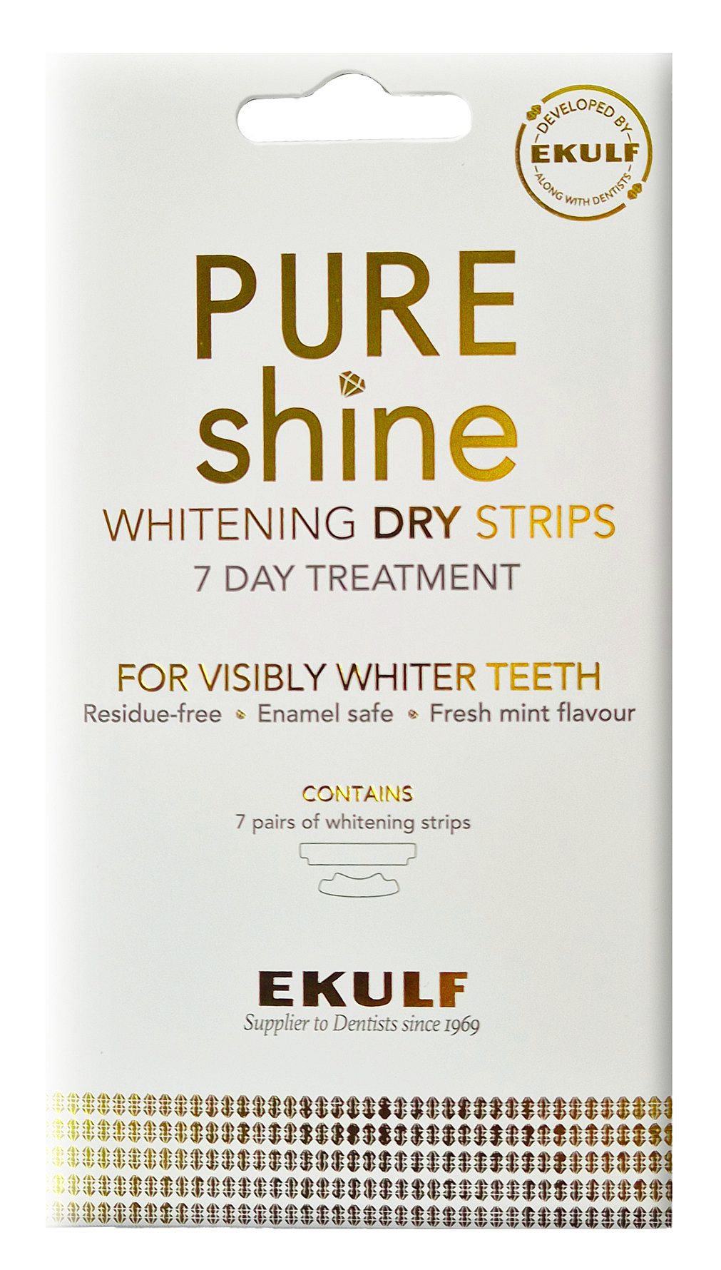 PURE shine Whitening Dry Strips er en strip, der gør dine tænder naturligt hvidere på bare 7 dage. Produktet er skånsomt mod tænderne og sikkert for emaljen.