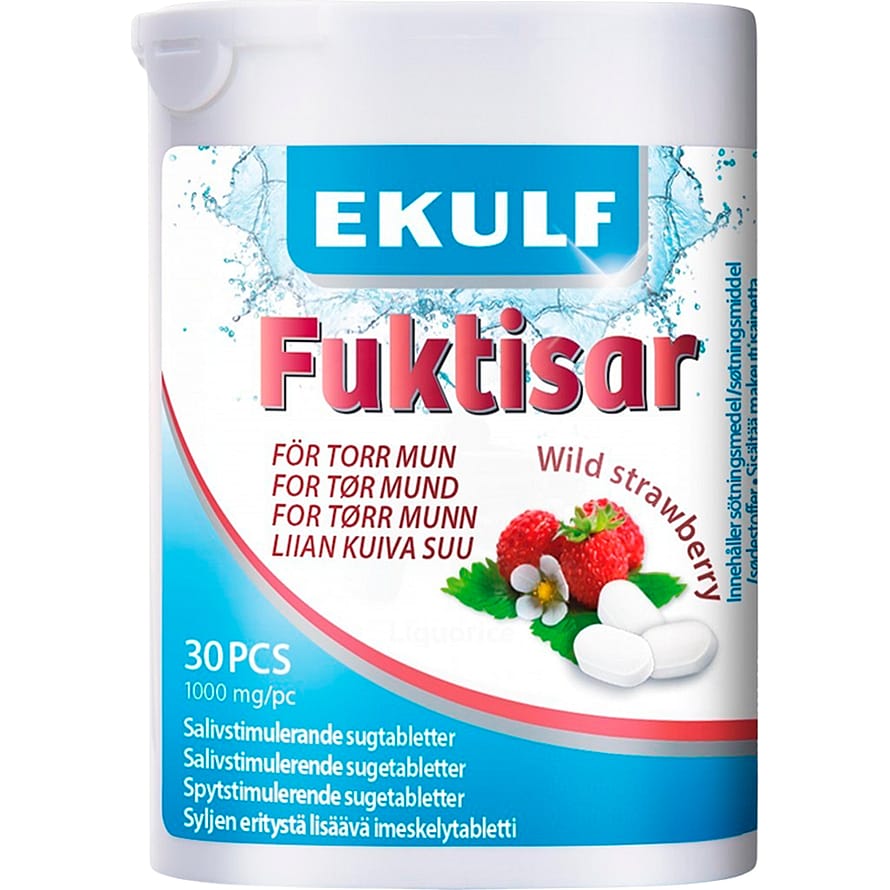 EKULF Fuktisar er sukkerfrie sugetabletter som stimulerer spytproduktionen. De aktive stoffer æblesyre, sodium citrate, dicalcium phosphate og xylitol bevarer fugtigheden i munden.