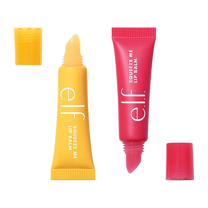 Et læbesæt med e.l.f.'s fugtgivende Squeeze Me Lip Balms i 2 eksklusive nye nuancer for en gennemsigtig farvetone og nærede læber.