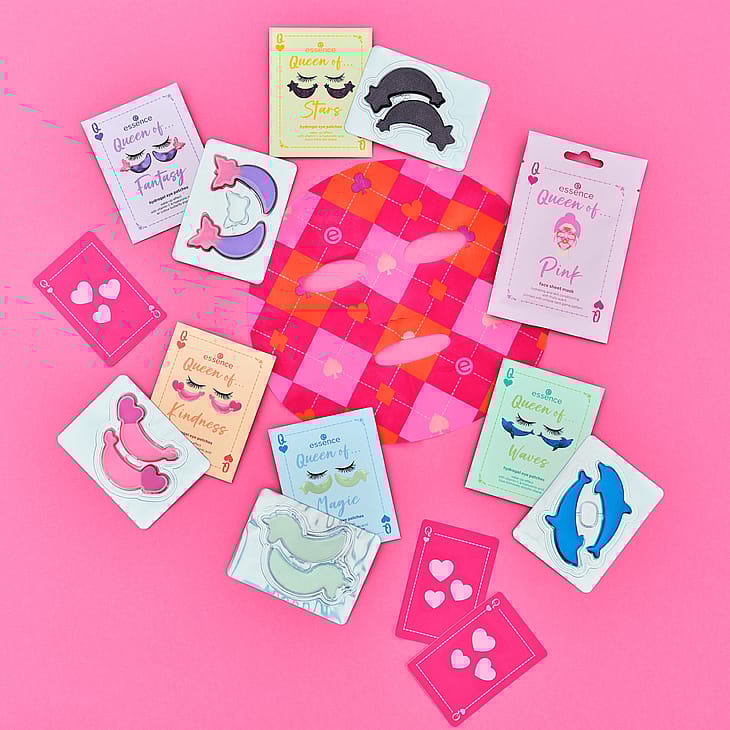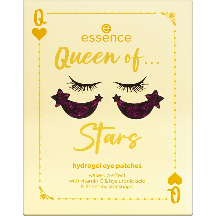 Essence Queen of... hydrogel-øjenpatches er den perfekte løsning til friske og strålende øjne. Hver pakke indeholder fem par øjenpatches i unikke farver og designs: enhjørninger, stjerner, sommerfugle, hjerter og delfiner. Ét par skiller sig ud med iriserende glimmer, men alle øjenpatches har én ting til fælles: lyse farver og smukke glimmereffekter.