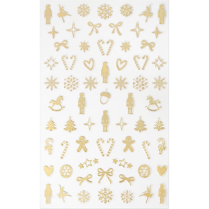 66 guldfarvede klistermærker med jule- og nøddeknækkerinspirerede motiver Nem påføring til kreative negledesigns Perfekt til at personliggøre ethvert neglelook Selvklæbende neglestickers.