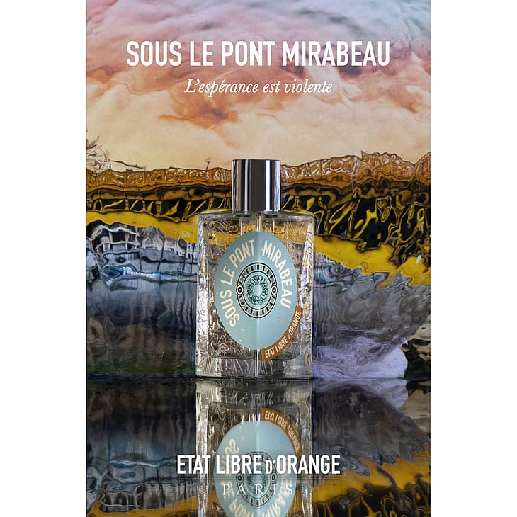 Et digt, der er lige så langsomt, som det er voldsomt, og som udtrykker det brutale og ønskværdige håb hos den, der gerne vil tro, hos den, der gerne vil elske. Vanilje, jeg skriver dit navn på vandet, med afdæmpede spor af røgelse og violet grønt. Sous le Pont Mirabeau er en parfume, der redder os, fisker os lydløst op af vandet, bringer os over Seinen, vores sjæle på vandet af vores essenser, bergamotte og rosa bær blandet med figen i en glasflaske, der brutalt genforener kroppe i harmoni med sjæle, der kommer tilbage til hende ved at følge hendes spor.
