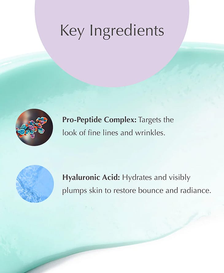 En intensivt fugtgivende creme til ansigt og hals, specielt udviklet til at modvirke synlige tegn på tørhed, såsom stram hud, mat hud og tørre linjer. Hyaluronsyre fylder hudens fugtreserver, mens peptider stimulerer hudens naturlige kollagenproduktion.