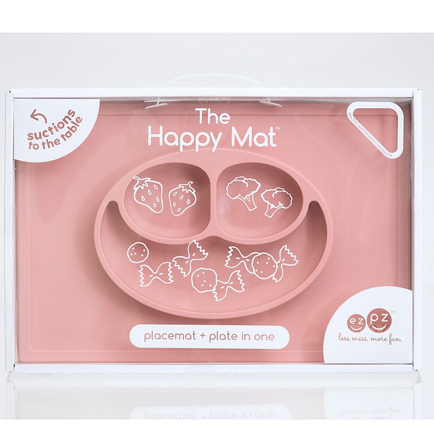 EZPZ Happy Mat er en - alt i én - tallerken og dækkeserviet i et. Produceret af højeste EU standard silikone (100%) som er helt fri for BPA, Phthalater, eller PVC. Happy Mat suger sig helt fast til bordet således at barnet ikke kan tippe eller løfte selve tallerknen.