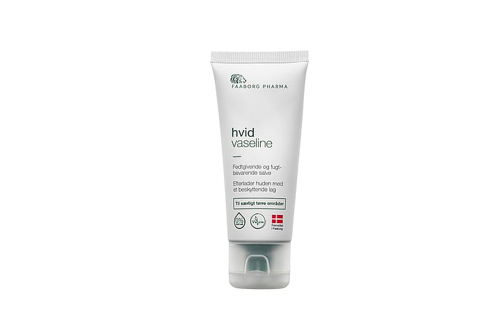 Hvid vaselin er en fedtgivende og fugtbevarende salve, til særligt tørre områder, fx tørre løber.