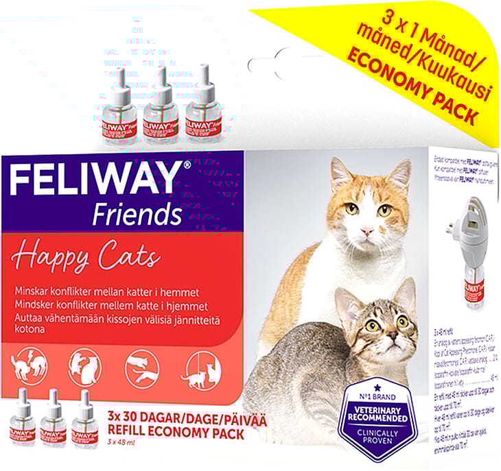 Pakke med 3 stk. Refill-flasker. Passer til FELIWAY Friends Diffuser. En Refill-flaske rækker til ca. 30 dage ved kontinuerlig anvendelse.