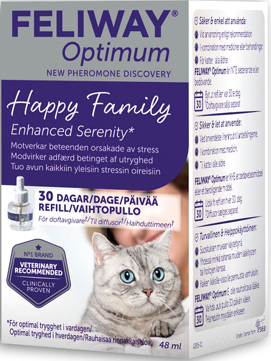 FELIWAY Optimum indeholder en helt ny sammensætning af feromoner, der giver katte endnu mere tryghed end nogensinde, og hjælper dem med at finde ro.