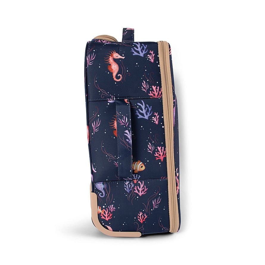 Vores kuffert fås i sommerlige yndlingsprints og har alt, hvad en børnekuffert har brug for; fra bagagestropperne og netlommen til småting på indersiden til det praktiske håndtag på toppen, det rengøringsvenlige ydermateriale af recycled RPET og det integrerede hjulsystem.