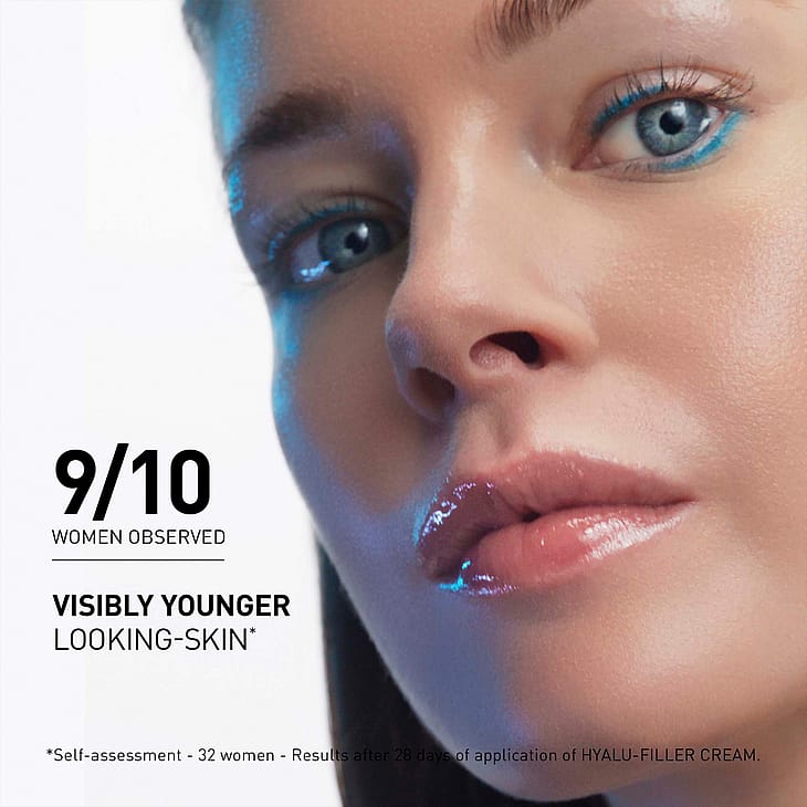 Hyalu-Filler Cream erstatter den tidligere Hydra-Hyal og giver en endnu mere intensiv plumping- og fugtende effekt. Klinisk dokumenterede resultater: 9 ud af 10 kvinder oplevede en synligt yngre hud efter 28 dage* Hudens fugtniveau steg med 86 % allerede 30 minutter efter påføring**, og efter 28 dage var huden 29 % mere fyldig***.
