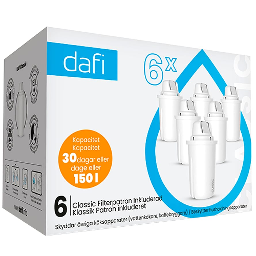 Filter til vandkande. Dafi Classic filterpatron, der reducerer:- KalkOg fjerner:- Klor- Tungmetaller- Herbicider og pesticiderKapacitet/filtrerer i 30 dage, eller op til 150 l vand.