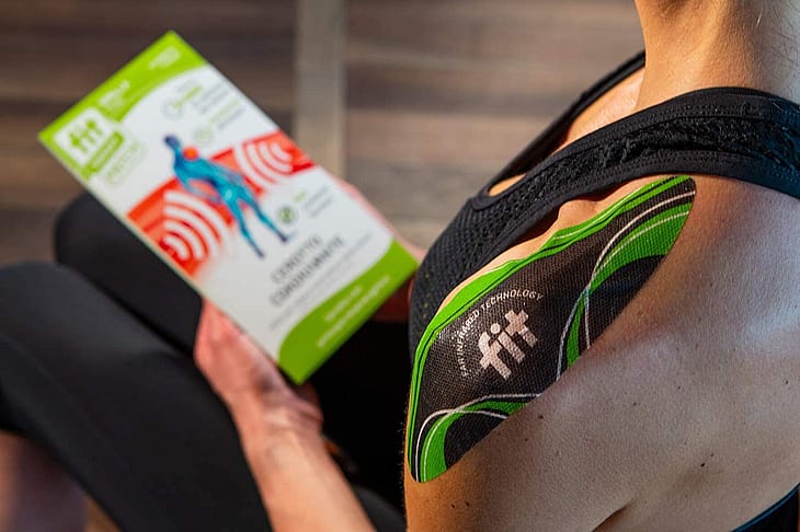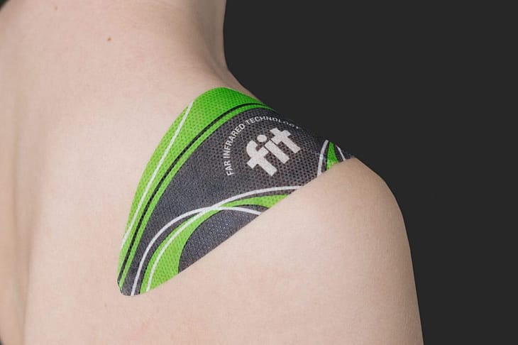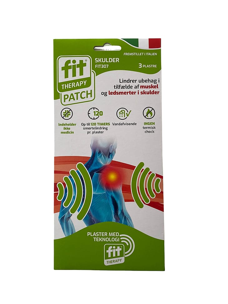 FIT smertelindrende plaster til skulderen. Anvendes ved skuldersmerter, led- og muskelsmerter. Plasteret forbliver funktionelt, når det er vådt (f.eks. ved brusebad).