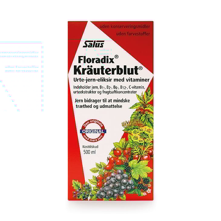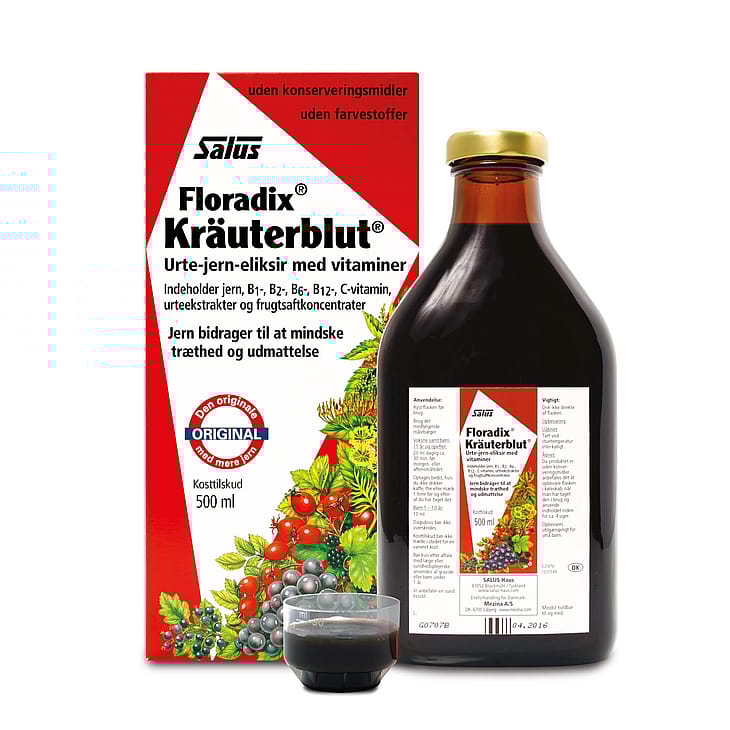 Vandigt urteekstrakt (62 %) af: brændenældeblad (Urtica dioica /Urtica urens), spinatblad (Spinacia oleracea), kvikgræs rodstængel (Elymus repens), kvanrod (Angelica archangelica), gulerod (Daucus carota), kommen frugt (Carum carvi), røllikeurt (Achillea millefolium), HVEDEKIM (Triticum aestivum), æble (Malus domestica), hibiscusblomst (Hibiscus sabdariffa), mælkebøtteurt (Taraxacum officinale), lancetbladet vejbred blad (Plantago lanceolata), kardemommefrugt (Elettaria cardamomum), pommeransskal (Citrus sinensis), malurt (Artemisia absinthium). Blanding af frugtsaftkoncentrater (13 %): drue, pære, solbær, kirsebær, brombær, appelsin. Honning, vandig gærekstrakt, ferrogluconat (jern), hyben juice koncentrat (Rosa canina) (0, 8 %), L-ascorbinsyre (vitamin C), HVEDEKIMekstrakt, nikotinamid (niacin), naturlig aroma, riboflavin-5’-phosphat, natrium (vitamin B2), thiaminhydrochlorid (vitamin B1), pyridoxinhydrochlorid (vitamin B6), cyanocobalamin (vitamin B12).