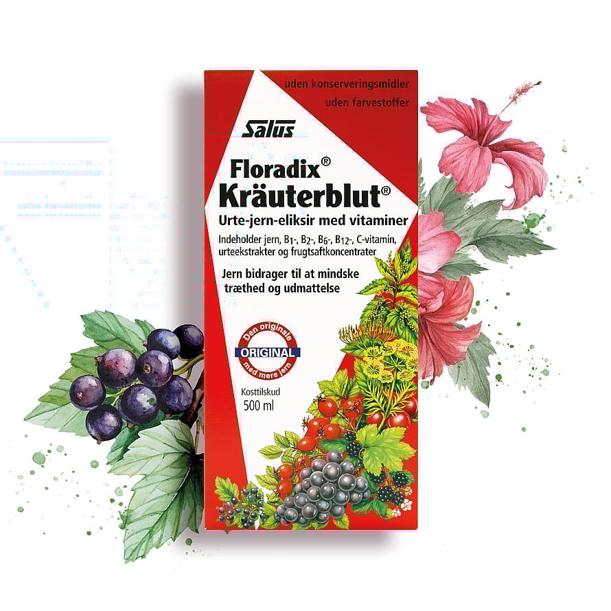 Vandigt urteekstrakt (62 %) af: brændenældeblad (Urtica dioica /Urtica urens), spinatblad (Spinacia oleracea), kvikgræs rodstængel (Elymus repens), kvanrod (Angelica archangelica), gulerod (Daucus carota), kommen frugt (Carum carvi), røllikeurt (Achillea millefolium), HVEDEKIM (Triticum aestivum), æble (Malus domestica), hibiscusblomst (Hibiscus sabdariffa), mælkebøtteurt (Taraxacum officinale), lancetbladet vejbred blad (Plantago lanceolata), kardemommefrugt (Elettaria cardamomum), pommeransskal (Citrus sinensis), malurt (Artemisia absinthium). Blanding af frugtsaftkoncentrater (13 %): drue, pære, solbær, kirsebær, brombær, appelsin. Honning, vandig gærekstrakt, ferrogluconat (jern), hyben juice koncentrat (Rosa canina) (0, 8 %), L-ascorbinsyre (vitamin C), HVEDEKIMekstrakt, nikotinamid (niacin), naturlig aroma, riboflavin-5’-phosphat, natrium (vitamin B2), thiaminhydrochlorid (vitamin B1), pyridoxinhydrochlorid (vitamin B6), cyanocobalamin (vitamin B12).
