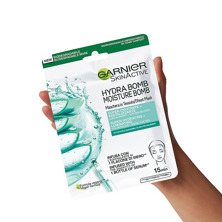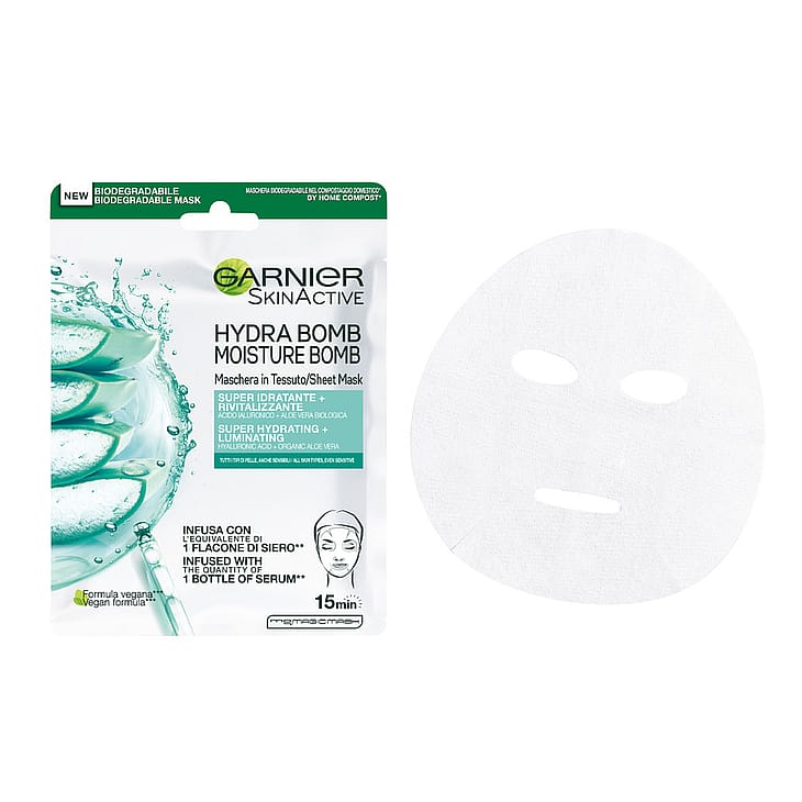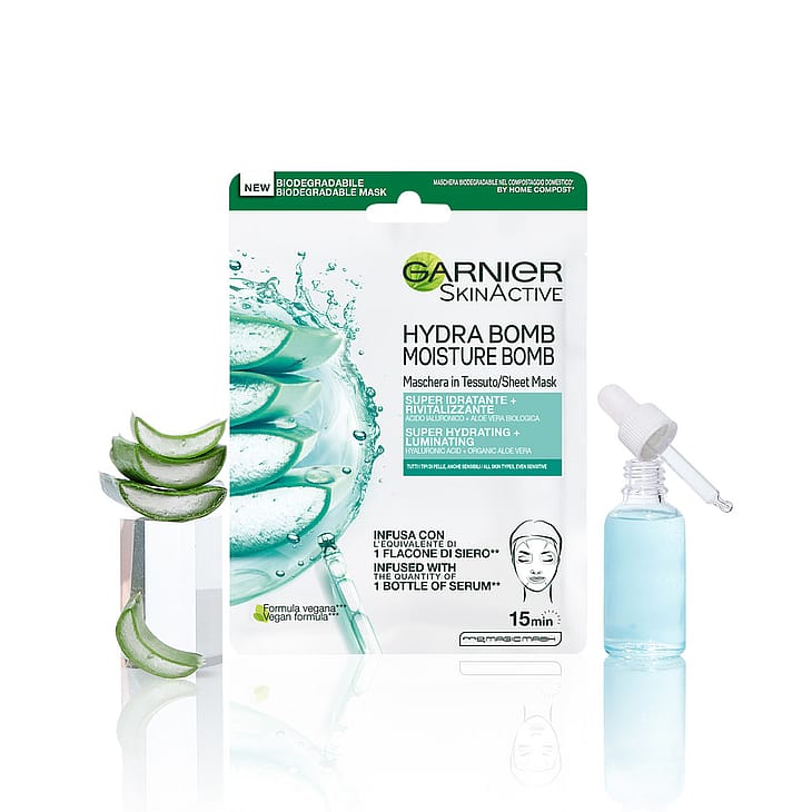 Garnier Moisture Bomb Aloe ansigtsmaske er beriget med en mængde der svarer til flaske serum med 28 ml og giver et boost med hyaluronsyre og aloe vera for en frisk og revitaliserende virkning.