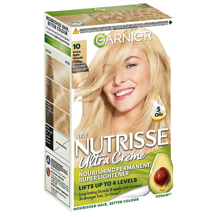Garnier Nutrisse Ultra Crème 10.01 Ekstra Lys Perlemorblond er en intenst nærende permanent hårfarve der giver en rig farve som holder længe og dækker grå hår 100%. Formlen er beriget med 5 olier for intens næring og dit hår efterlades 5x stærkere og 2x mere skinnende(2).