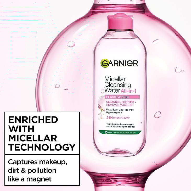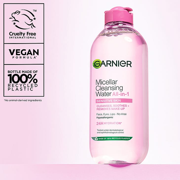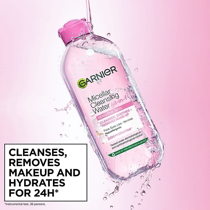 - Micellar water renser ansigtet og fjerner makeup.