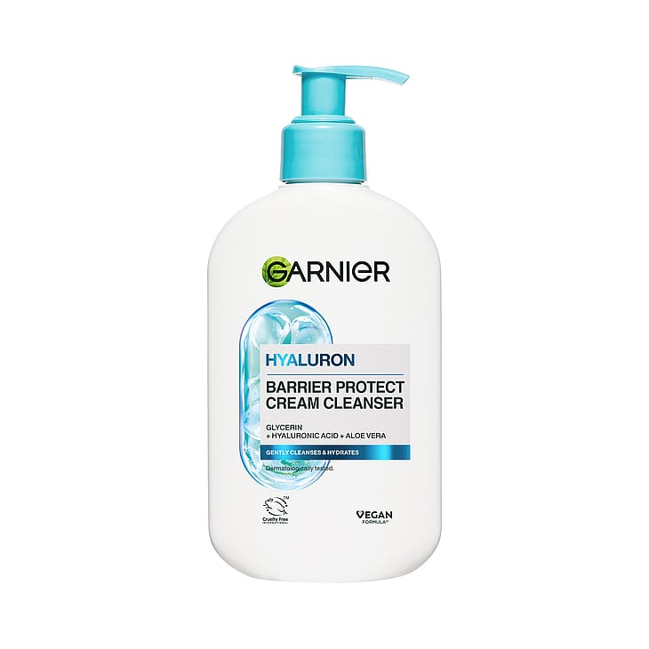 Garnier Hyaluron Barrier Protect Cream Cleanser er en beroligende rensecreme som fugter og renser din hud samt skånsomt fjerner makeup og urenheder. Formlen hjælper til at opretholde hudens naturlige fugtbarriere og er beriget med aloe vera og hyaluronsyre.