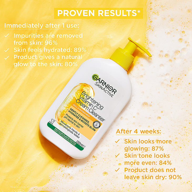 Garnier Vitamin C* Brightening Cream Cleanser er en nænsomt rensende creme-til-gel beriget med C-vitamin*. Formlen fjerner skånsomt makeup og urenheder samtidig med at den giver glød og opretholder hudens naturlige fugtbarriere.