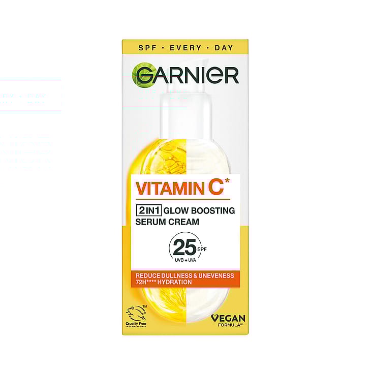 Garnier Garnier Vitamin C* 2in1 Glow Boosting Serum Creme er et 2-i-1 hudplejeprodukt, koncentreret med 20% serum der er beriget med C-vitamin*. Denne serumcreme fungerer som et serum og fugter samtidig huden som en creme. Formlen er beriget med C-vitamin* og Super-Citrus. Inden for hudpleje, er C-vitamin kendt som en ingrediens der hjælper med at give huden glød og reducere mørke pletter. Super-Citrus er en fornybar ingrediens som er kendt for at gøre hudtonen mere strålende. Garnier SkinActive Vitamin C 2-in-1 Brightening Serum Cream er velegnet til alle hudtyper, selv sensitiv hud**. Testet under dermatologisk kontrol.