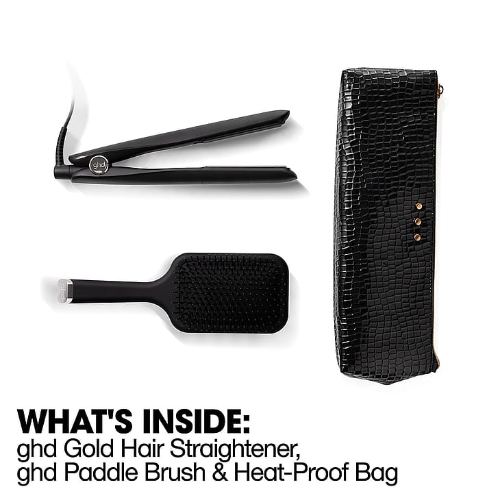 Includes ghd Gold styler, ghd The All Rounder Paddle Brush and Luxury Croc-Inspired Heat Resistant Bag. Value of the gift set: 2437 DKK.