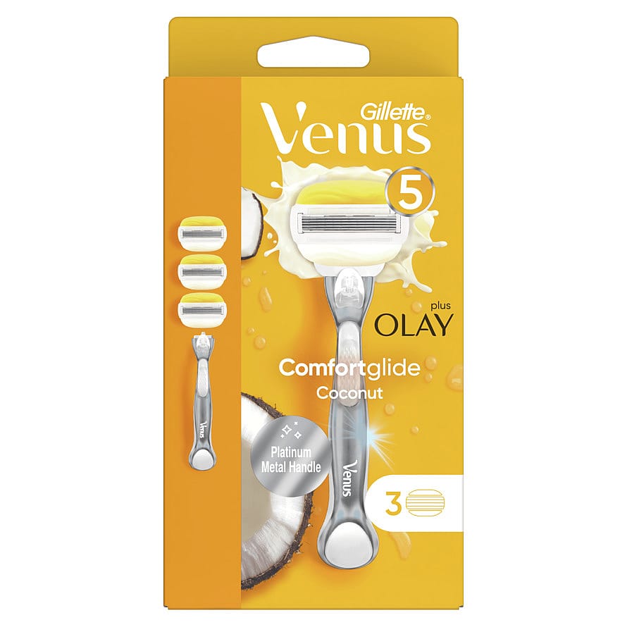 Venus-barberblade til kvinder er skabt efter kvindekroppen. Venus Comfortglide Coconut plus Olay-barberskrabere til kvinder har 5 blade til en blød og glat barbering, der holder i længden. Barberbladene er forsynet med Olay-fugtbjælker, der frigiver bodylotion med duft af kokosnød og får skraberen til at glide nemt og behageligt. Med et bevægeligt design, der tilpasser sig efter kroppens konturer. Alle Venus-barberblade passer til alle Venus-skrabere (undtagen Simply Venus og Venus Pubic Hair and skin).