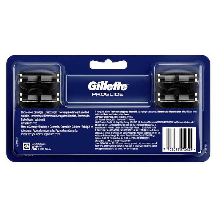 Gillette ProGlide-barberblade til mænd, med blade, der sidder tæt sammen, så du kan få den mest behagelige barbering, og med præcisionstrimmer bagpå, så du trygt kan komme helt tæt på.
