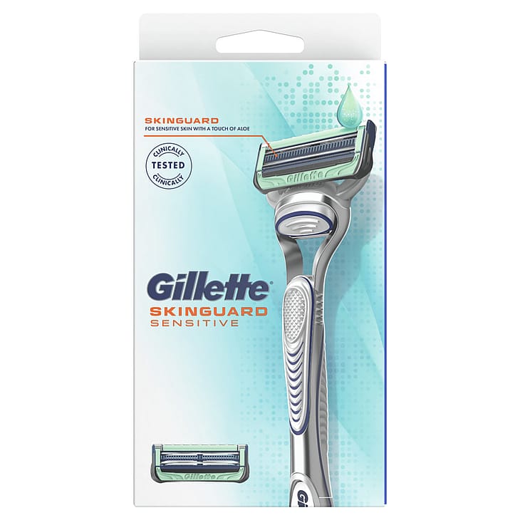Gillette SkinGuard Sensitive er Gillettes første skraber specielt til mænd med sensitiv hud. Den unikke SkinGuard mellem bladene absorberer trykket, udglatter huden og hæver bladene, så håret skæres på niveau med huden for at hjælpe med at forhindre irritation og ubehag. Forbedret smøring (vs. tidligere SkinGuard) før og efter bladene beskytter huden mod irritation, mens to perfekt placerede blade minimerer hiven og trækken. SkinGuard Sensitive-barberskraberen, med strejf af aloe, er klinisk testet til sensitiv hud og giver dig samtidig den pålidelige barbering, du forventer fra Gillette.