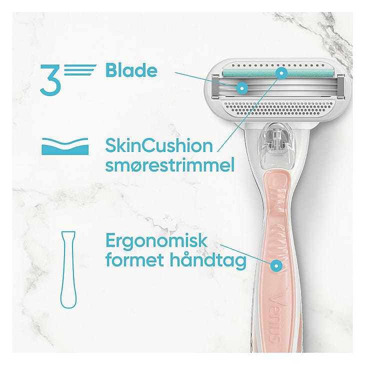 Vores SkinCushion-smørestrimmel (og SkinElixir med et strejf af aloe) hjælper med at beskytte din hud mod irritation. Og hvis du mangler flere måder at give din hud den kærlighed, den fortjener, se hele udvalget af Venus-produkter, fra barberskrabere til barbergeler, engangsskrabere til ansigtsskrabere og meget mere.