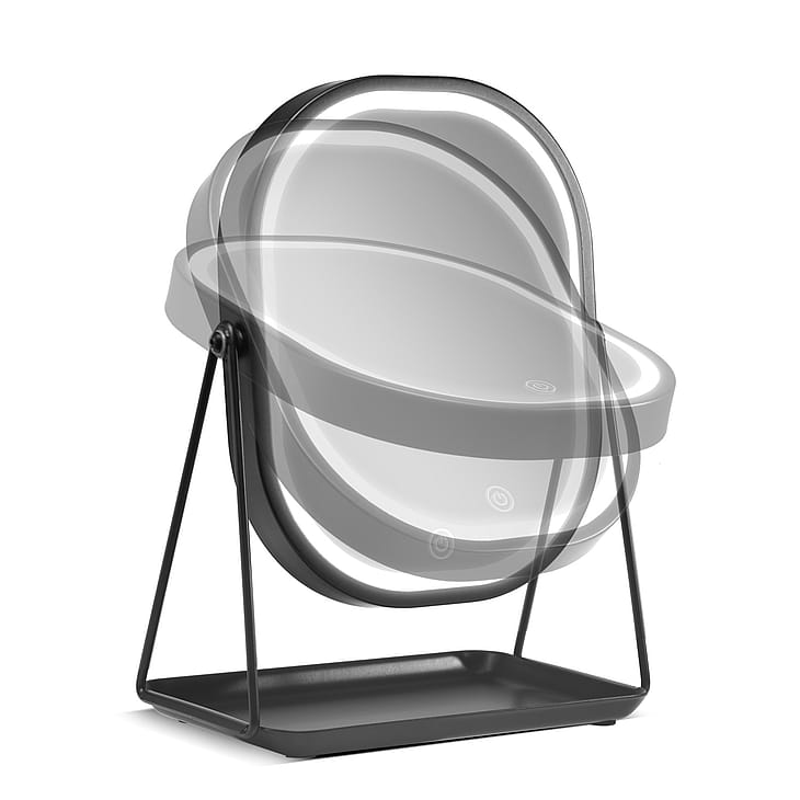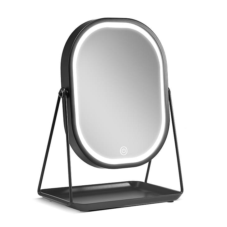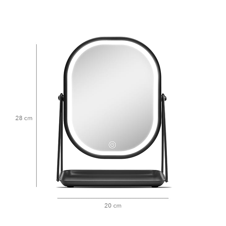 Dette bordspejl med LED lys og bakke er den perfekte tilføjelse til dit badeværelse eller makeupbord. Det matte sorte design giver et elegant udtryk, der passer perfekt til enhver indretning. Med det kraftige LED lys kan du nemt og præcist lægge din makeup, og med touch-knappen kan du justere lysstyrken efter behov. Bakken er ideel til opbevaring af smykker eller hårnåle, så du altid har dine accessories lige ved hånden.