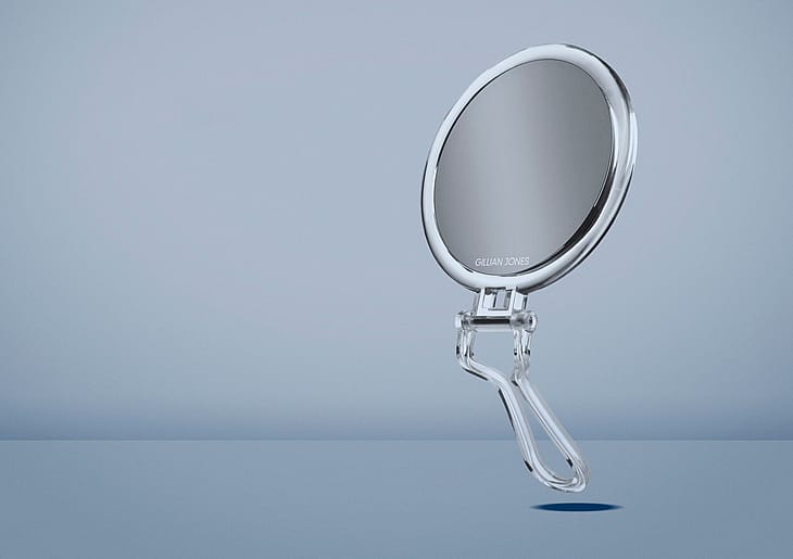 Gillian Jones hånd-/ståspejl i klar plast med 7 x forstørrelse. Grebet kan vippe så det også kan bruges som bordspejl, og du kan få den perfekte vinkel til at lægge din makeup eller plukke dine øjenbryn.