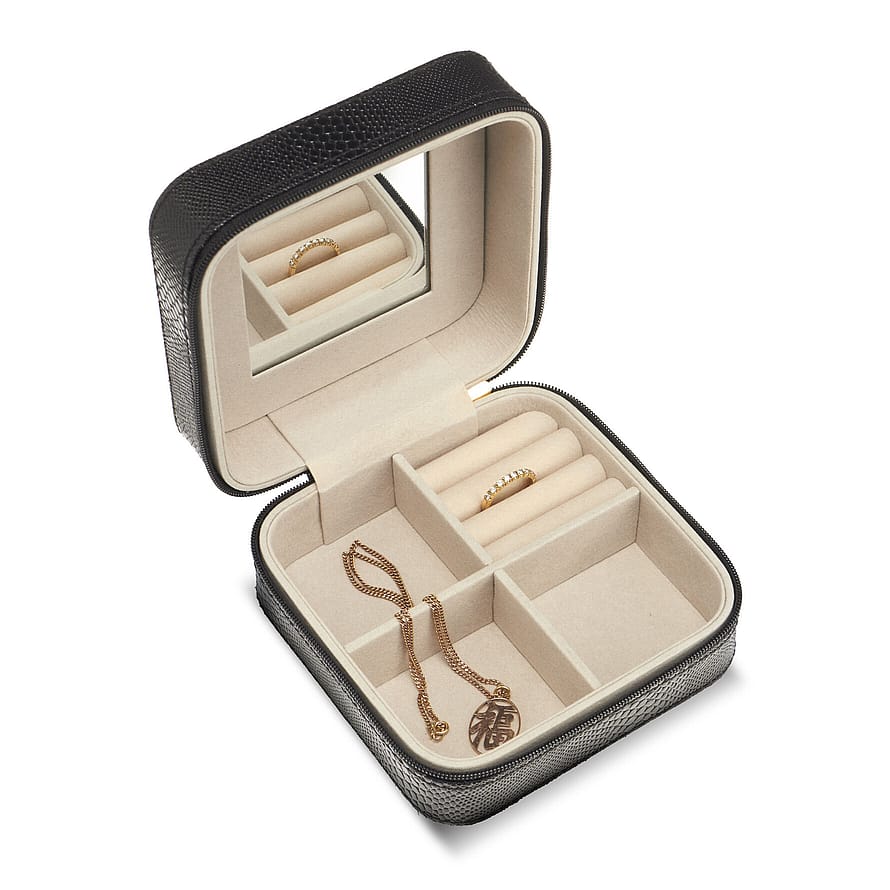 Gillian Jones smykkeskrin i sort vegansk snake-præget PU. Smart lille smykkeskrin med 3 rum, og plads til ringe og ørestikker. I låget er der et spejl. Smykkeskrinet lukkes med lynlås og en smart vedhængs-tassel, og har Gillian Jones logo i guld præget på toppen.