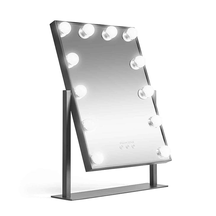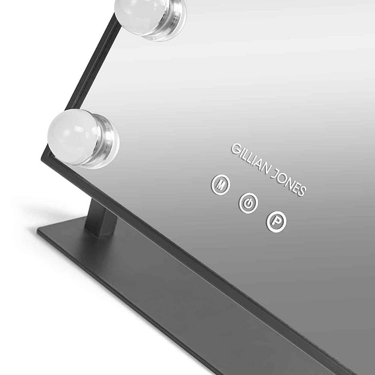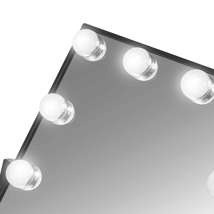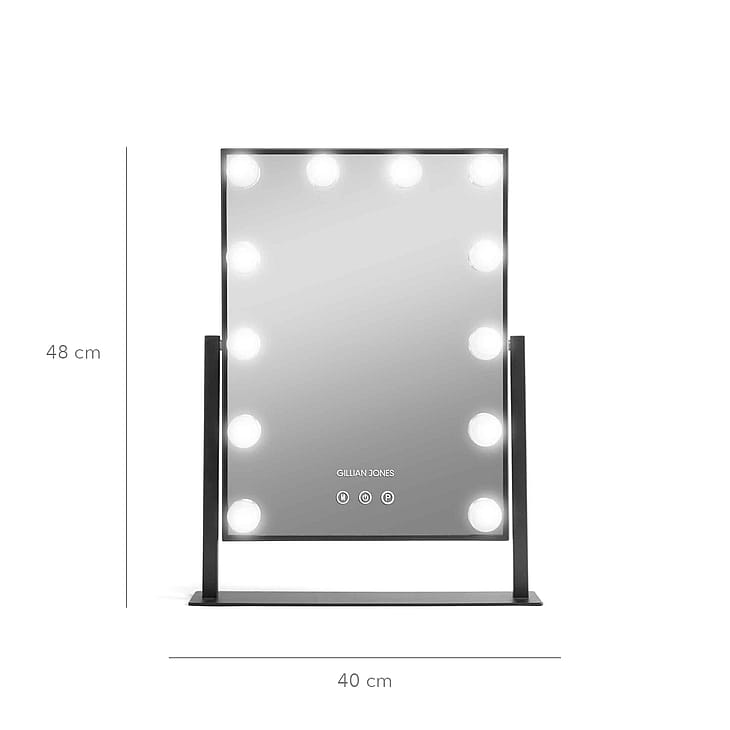 Stort Makeup artist spejl i sort med 12 kraftige LED pærer der kan styres med touch funktion. Lyset har 3 forskellige farvetoner, og ved hjælp af touch funktionen kan du skrue op eller ned for lysstyrken. Selve spejlet kan roteres 360 grader.