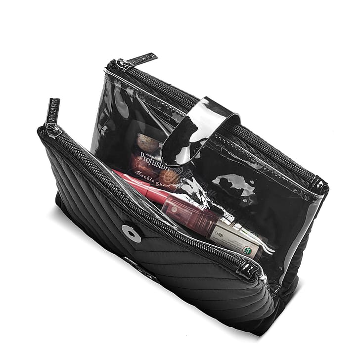 Makeup pungen åbnes i midten og et vindue af PVC fri plast i begge sider, giver det perfekte overblik.
