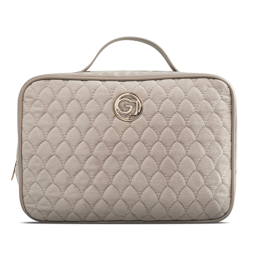 Du kan endda maskinvaske den ved 30 grader og tørretumble den ved lav varme. Denne toilettaske er ikke kun praktisk, den er også designet med stil for øje. Det beige velour og quiltede mønster giver tasken et luksuriøst udseende, der vil gøre den til et stilfuldt tilbehør på dine rejser.