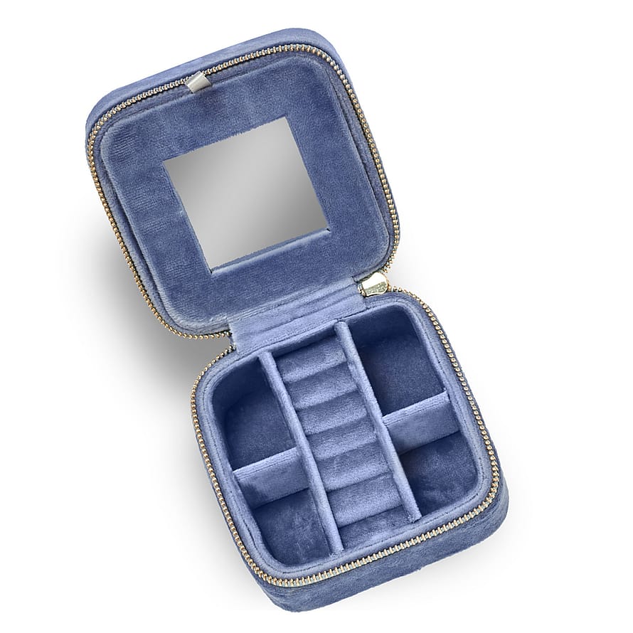 Lille smart smykkeskrin i blå velour. Smykkeskrinet er indrettet med rum til ringe, halskæder og armbånd, samt ørestikker. I låget er et lille spejl. Smykkeskrinet åbnes og lukkes med lynlås.