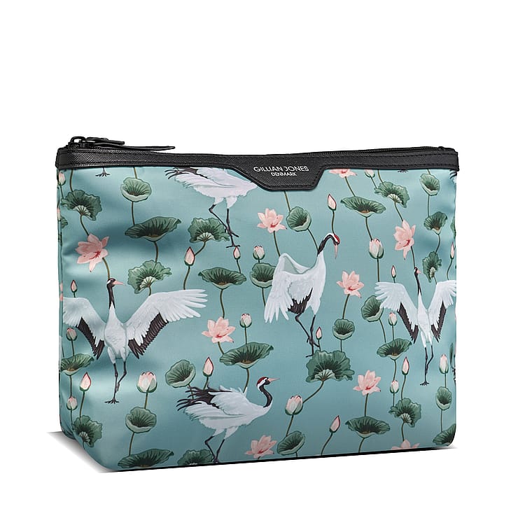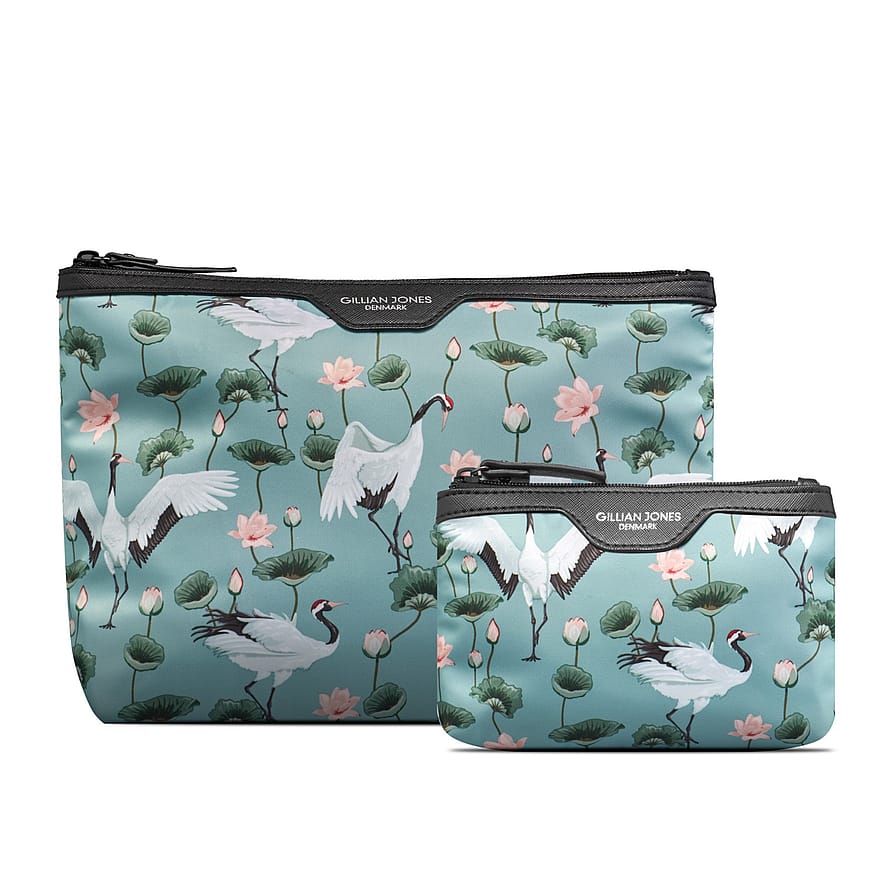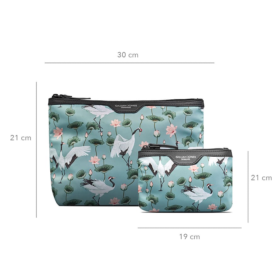 Sæt med toilettaske og makeup pung, fra Urban Travel linjen der er designet og produceret med så lidt co2 aftryk som muligt. Både toilettasken og makeup pungen udvider sig efter hvor meget du putter i, designet er stramt og leveres uden unødvendig udstopning. Materialet af genanvendt nylon med en fast kant i PU der gør at kosmetik tasken holder faconen. Kan maskinvaskes ved 30 g.Inden i toilettasken er der en lynlås lomme samt 2 net lommer. Der er mange anvendelse måder; Hold styr på din mobiltelefon incl headset, opbevar dine solbriller sammen med kreditkort, og selvfølgelig til din uundværlige make up og pleje midler. Kan maskinvaskes ved 30 grader, og lave omdrejninger, og tørres ved lav varme. Alle toilettaske-sæt fra Gillian Jones Urban linjen fås i mange forskellige farver og prints.