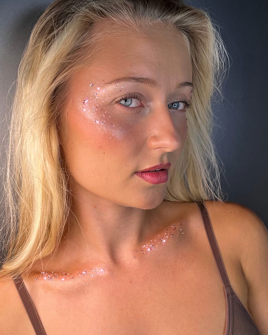 På huden: Påfør en lille mængde aloe vera “glitterlim” på huden med den lille makeupbørste. Dyp derefter børsten i glitteret og dup glitteret ovenpå gelen. Gelen tørrer ind, og glitteret bliver siddende på huden. Fjernes nemt med vand.