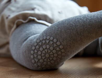 Strømper, strømpebukser og knæbeskyttere udviklet med gummidutter, så din baby kan stå fast, gør kravleudviklingen nemmere og mere sjov for dit barn. Med gummidutter ovenpå fødderne, under fødderne samt på knæene, er det meget nemmere for dit barn at stå fast og være mere modig i træningen.