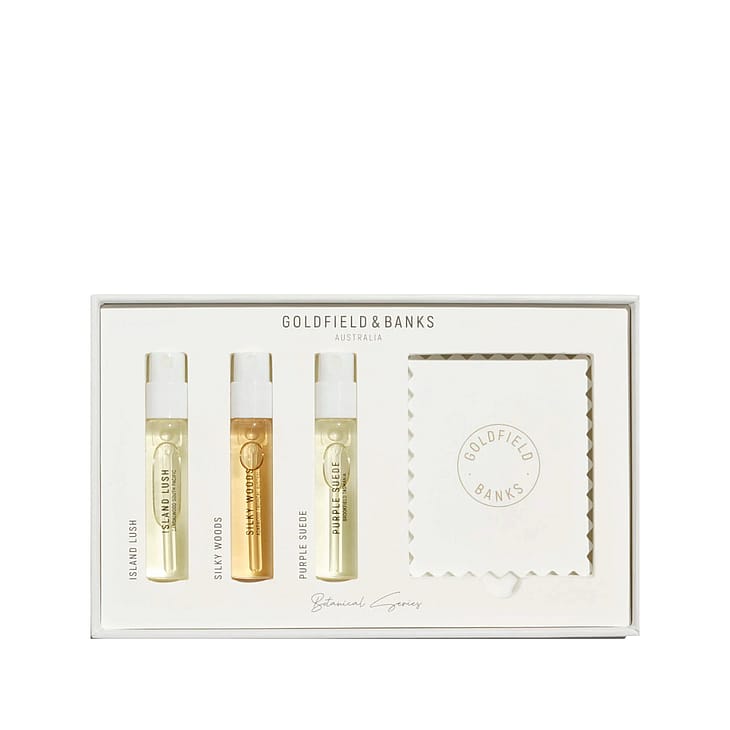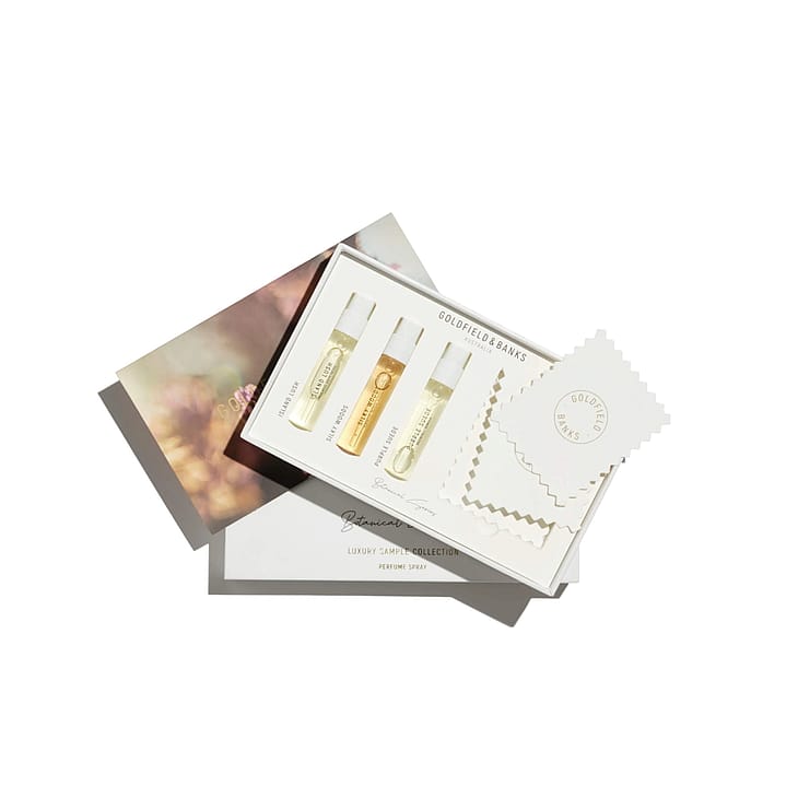 Inspirer dine sanser – eller giv en duftfuld gave – med tre eksklusive 2 ml parfumesprays, duftkort og et smukt illustreret hæfte om Goldfield & Banks’ Botanical Series.